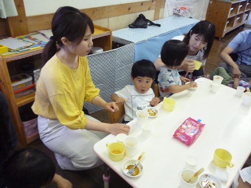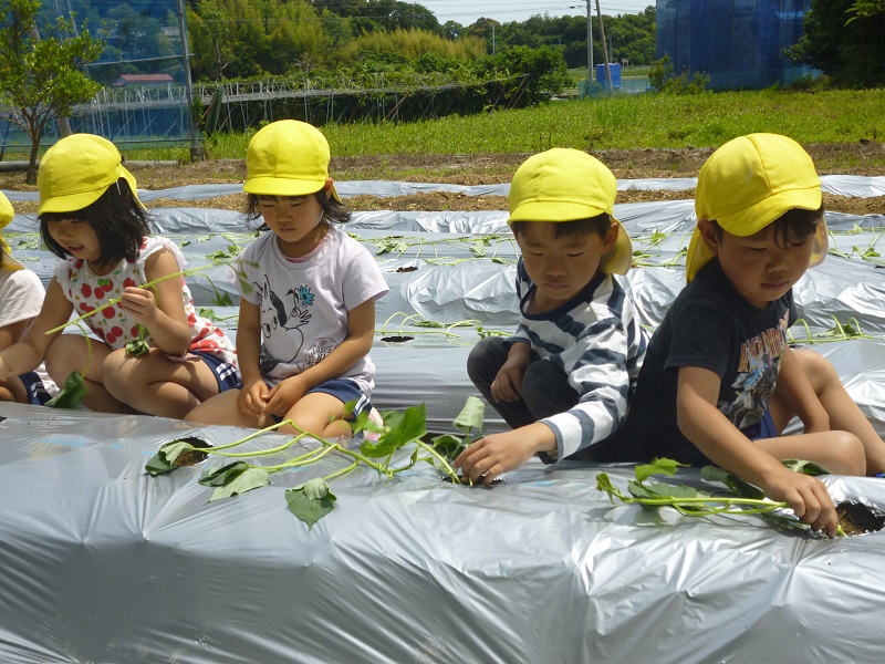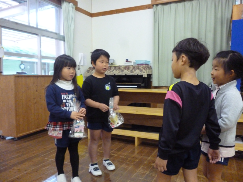 園の日常 野菜がぐんぐん成長しています① 年長さんが先日、近くの種苗店で苗を買って来て植えたとうもろこし、ミニトマト、きゅうり、えだ豆がぐんぐん成長しています。 園児たちは、水やりなどお世話をしながら収穫の日を楽しみにしています。 【左】ぐんぐんつるを伸ばすきゅうり 【右】たくさん実をつけているミニトマト 2019/06/19 保育参観日 6月8日(土) 保育参観日 お父さん・お母さんとクラスの活動に参加する子ども達はどの子も笑顔で、一緒にいられる嬉しさがこちらにも伝わってきましたよ。 2019/06/10 よもぎまんじゅうクッキング 5月31日(金) ヘルスメイトさんにおまんじゅうの作り方を習い、年長児がクッキングに挑戦しました。 自分達の作ったおまんじゅうの味は格別だったようで、『この前スーパーで買って食べたけど、自分で作ったおまんじゅうの方が美味しい!!』や『何回も噛んでいくと甘くなってきた』などと感想を聞くこともできました。 2019/05/31 お芋の苗植えに行きました 5月30日(木) お芋の苗植えに年長・年中組さんが出かけました。 『美味しいお芋ができますように』と気持ちを込めながら苗植えに挑戦しました!! 苗植えの帰りに空を眺めると、太陽の周りにうっすら虹のようなものがかかっていましたよ♪ 2019/05/30 おやこ運動会 5月18日(土)令和になって初めての保育園行事『おやこ運動会』が行われました。 お父さん・お母さんと一緒に競技に参加して、どの子もいい笑顔を見せていましたよ!! 2019/05/20 こいのぼりが元気に泳いでいます 先日、保護者のお父さん達が保育園に鯉のぼりポールを立ててくれました。 元気に泳いでるこいのぼりを見て『お~い!!』と手を振ったり、『ほんとや~、屋根より高いね』と話し合う子ども達の姿がありましたよ。 2019/04/15 2019年度 入園式 4月4日(木) 入園式が行われました。 2019年度が始まりました。園庭の桜もキレイに咲き、子ども達の入園を祝福しているかのようです。 新しい保育室に新しい先生。子ども達は、その小さな胸をたくさんの期待や不安でいっぱいにしている事と思います。一日でも早く子ども達が安心して過ごせる場所となるよう職員一同、日々の保育に当たりたいと思います。 これから1年間どうぞよろしくお願いいたします。 2019/04/05 お別れパーティー 3月19日(火) 卒園式も今週末となり、年長児とのお別れパーティーを行いました。 パーティーでは、年中児より年長児に『小学校でも頑張ってね』の願いを込めて手作り鉛筆立てのプレゼントが贈られたり、職員の劇・年長児からの歌の披露がありました。 そして最後は、美味しい給食をバイキング形式でお腹いっぱい頂きました♪ 2019/03/19 のっぺい汁クッキング 3月1日(金) 年長児がヘルスメイトさんと一緒にクッキング活動に参加してのっぺい汁作りに挑戦しました。今回のクッキング活動で初めて包丁を握ってみた子どももいましたが、『ニンジンを切るのは堅かった』『ネギはぬるぬるしていた』などとクッキングを通して色んな感想が聞けましたよ。年長児の作ってくれたのっぺい汁は給食で提供され、みんなで美味しく頂きました。年長さん、ありがとう!! 2019/03/01 文化祭オープニングセレモニー 3月1日(金) 十市・緑ヶ丘地区の文化祭が保育園となりの多世代交流プラザで行われ、年長児がオープニングセレモニーで歌の披露をしました。文化祭に年長児の作品も展示していますので、どうぞご覧になってみて下さい。 2019/03/01 Page 1 2 3 4 5 6 7 8 9 10 11 12 13 14 15 16 17 18 19 20 21 22 23 24 25 26 27 28