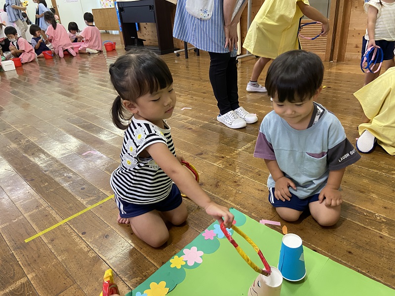 2歳児ぺんぎん組のプール参観がありました。コップで水をすくってみたり、ワニさんのポーズで歩いてみたりと水にもだいぶ慣れ、思い思いの楽しみ方でプールを楽しんでいました♪